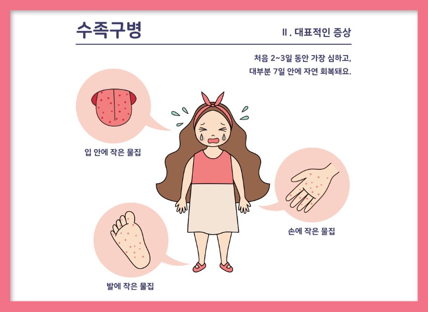 - 발병 부위: 손, 발, 입에 물집이 생기며, 특히 입안의 물집이 터지면 궤양이 생겨 음식물 섭취에 어려움을 겪을 수 있습니다.